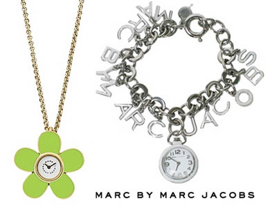 そんなマークジェイコブスの自身のブランドマークByマークジェイコブスは、斬新ながら、合わせ方によって女性をとても美しく彩ってくれる特徴のあるデザインが人気。特にユーモアあふれる遊び心満点の時計は、意外にレアなアイテムです。フックで長さの調節が可能なブレスレットウォッチ($275.00)は、1cm位のロゴアルファベットのチャーム付、時計部分は2.5cmx2cm、ブレスレット全長21cmで手元を華やかに演出します。