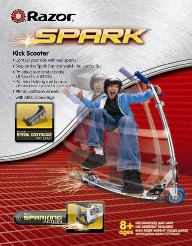 Razorスパーク。このモデルは、初期型A&AWモデルのキックバーを改良したもので、従来通り、調整可能な柔らかいグリップのハンドルバー、手軽に持運べる折りたたみ式に加えて、その名のとおりブレーキ後部のスパークバーを踏み込むと、火花が飛び散るという派手なパフォーマンスのキックスクーターで、他社より20%多い火花を出す、5フリントパッドを使用(交換可能)。