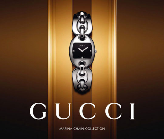 グッチのアクセサリー&ジュエリーのシンボルとして有名なマリナチェーンは、1960年代フィレンツェの顧客たちが愛好していたヨットの世界からインスパイアされた、スタイリッシュなニューウォッチコレクション(#9575464: $675.00 #9575465: $780.00 #9575515: $675.00)。